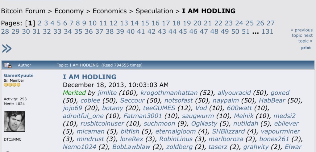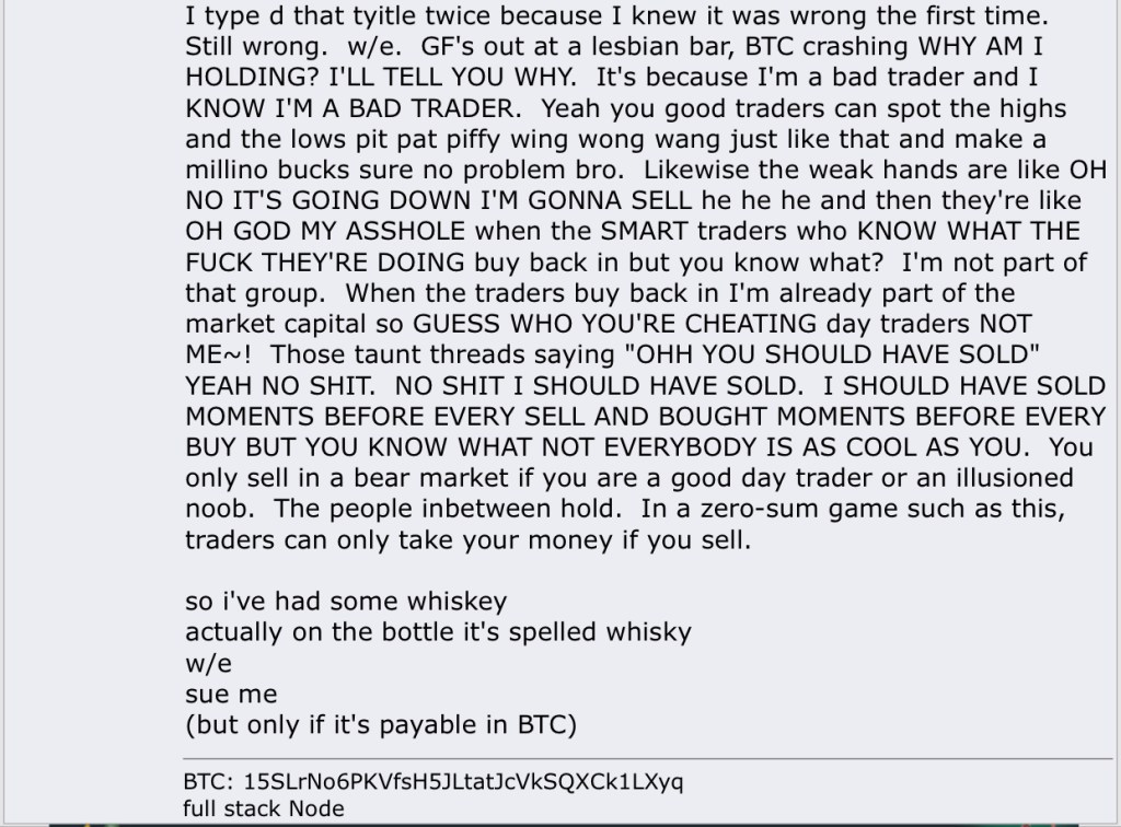 The post is hilarious, evidently written by someone that was drunk at the time. It was a rant written in response to a sharp decrease in the bitcoin price. He lays out his reasons for not selling. He knows that he is a “bad trader” and the good ones “can only take your money if you sell.” He is done with trying to time the market.